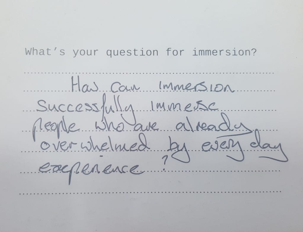 The Network asked those who attended to consider their own question on immersion, the results were thoughtful and provocative contributions. Below are a couple of examples that got the Network thinking: